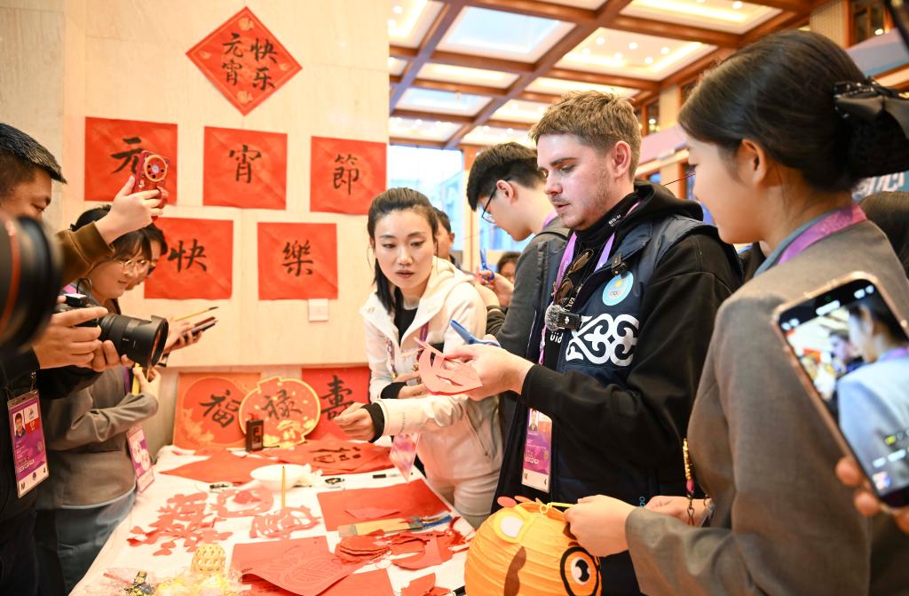 2月12日,一名哈萨克斯坦记者正在勾当现场体验剪纸。当日是夏历正月十五元宵佳节。工做人员举行舞龙舞狮表演、制做花灯、剪纸等互动勾当,共度佳节。记者 胡虎虎 摄!